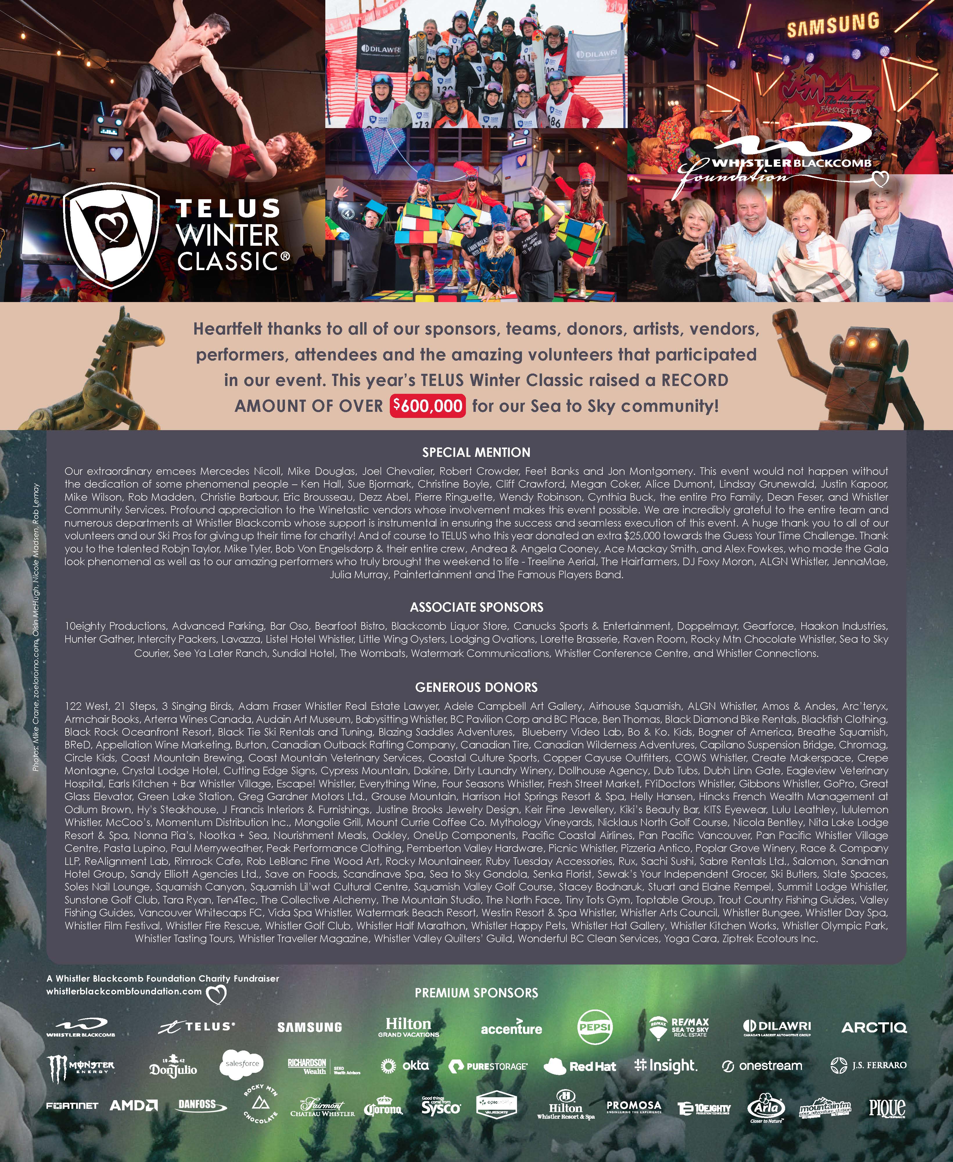 Your participation in the TELUS Winter Classic allows us to make a huge difference in our communities. Since 1992, the Whistler Blackcomb Foundation has donated over $25 million to local charities. Support is given in the areas of health, human services, education, recreation, arts & culture and the environment with a special emphasis placed on children, youth and family programs.
